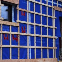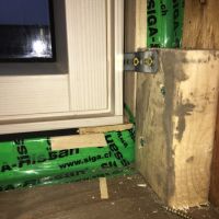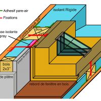 ![]() -Adhésif vert Siga-Rissan pour l’étanchéité à l’air entre le contre plaqué et le cadre de support -liseré bleu (aperçu d’un morceau d’isolant rigide que richard a aussi à faire installer à la place du bois à certain endroit) -Bande noire : Hannoband non encore totalement déployé (on voit encore l’extérieur) -cadre de fenêtre