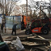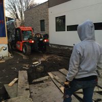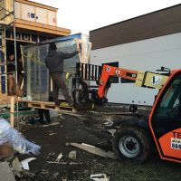 Leur déchargement a été tout une épopée. En effet la façon dont les fenêtres était installées dans le container les rendaient particulièrement difficiles à sortir. Notamment la palette en bois dessous était trop petite pour pouvoir y glisser les fourches de la machine élévatrice. Au final, il a fallu une journée entière à 4 pour amener les fenêtres du container vers l’intérieur de la maison. La manipulation de la grande baie vitrée qui pèse 300kg a donner pas mal de frayeurs à tout le monde. Mais à 16h tout était au chaud dans la maison (au froid en fait, car pas de fenêtres installées)